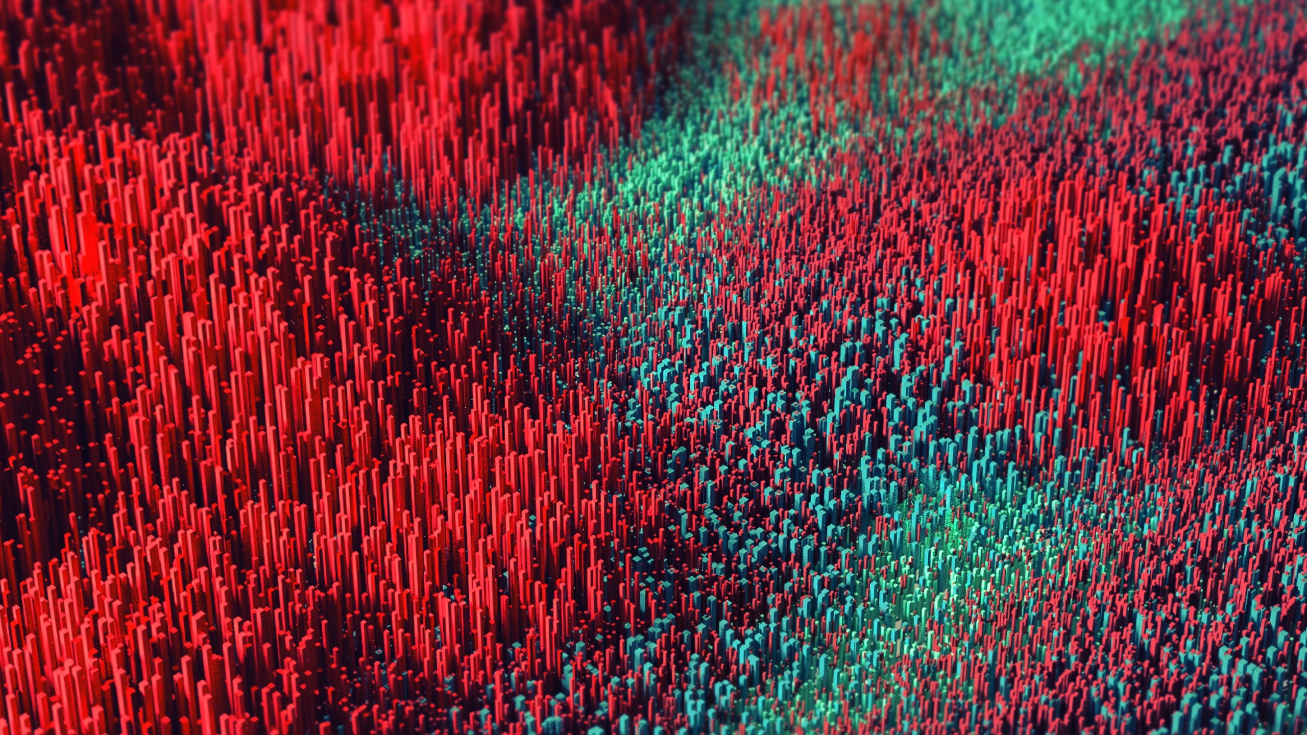 This abstract wave wallpaper turns your screen into a field of red-and-teal depth—thousands of vertical shapes rising and falling like a digital ocean. The “wave” pattern creates motion without feeling chaotic, so it stays eye-catching while still working as a clean daily background.