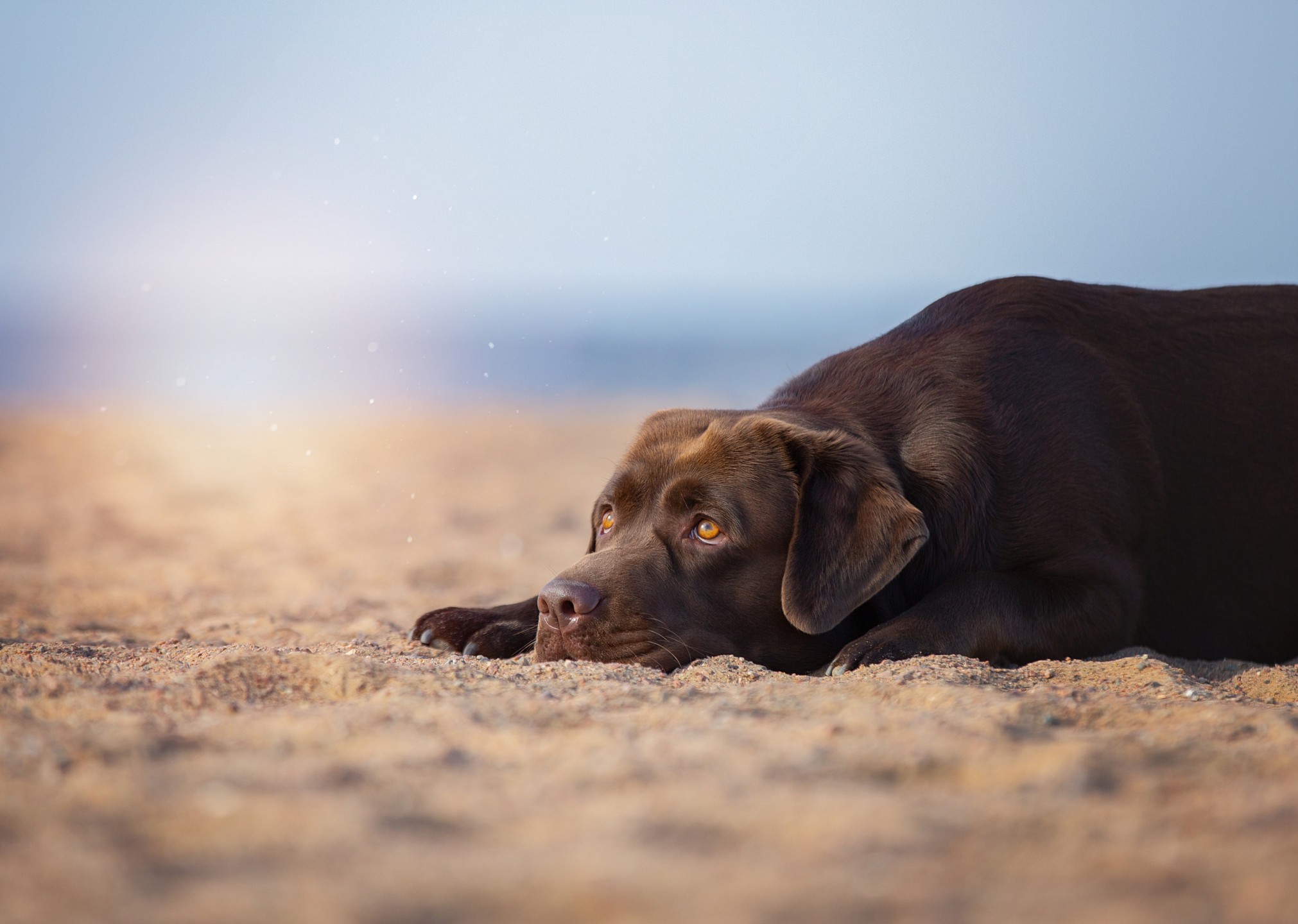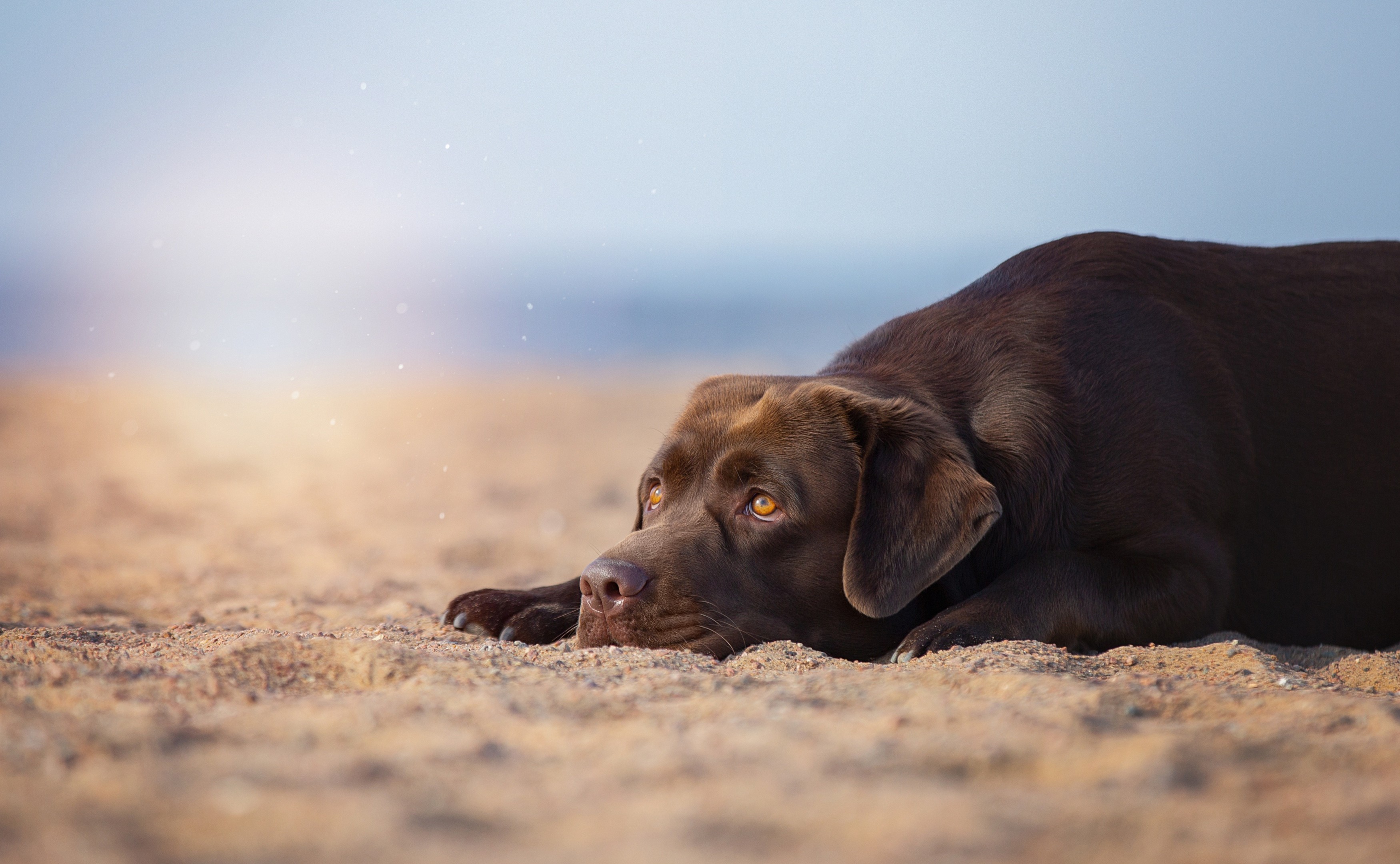 Soft sand, a gentle horizon, and a calm gaze—this chocolate lab wallpaper brings an easy, peaceful mood to your screen. The pup rests low in the frame, so the scene feels cozy without crowding your desktop.