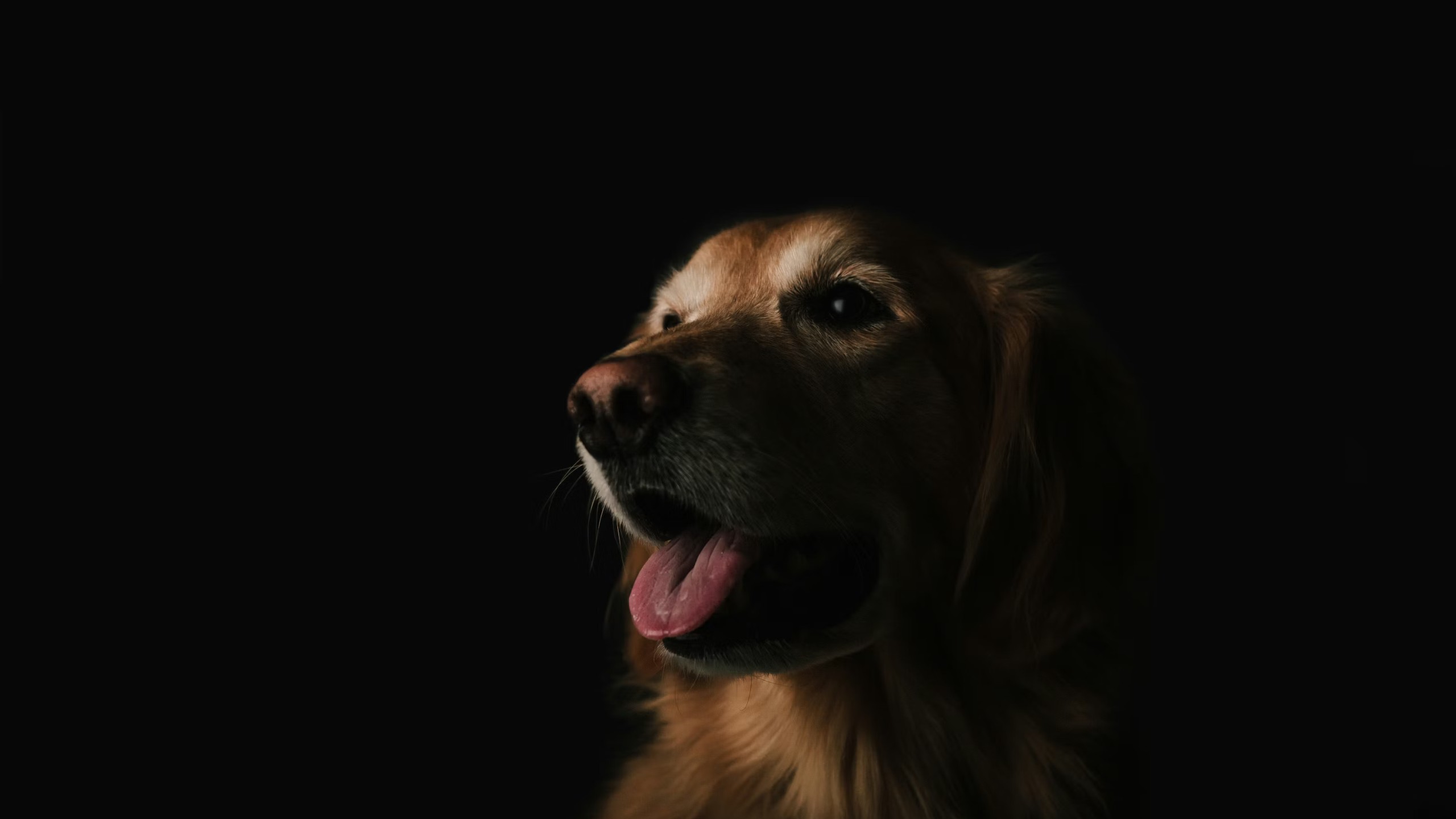 This golden retriever wallpaper focuses on expression and lighting, isolating the subject against a deep black backdrop so every detail of the fur and face stands out. The composition feels intimate, almost studio-like, with the dog softly lit as if caught in a quiet moment just off-camera.