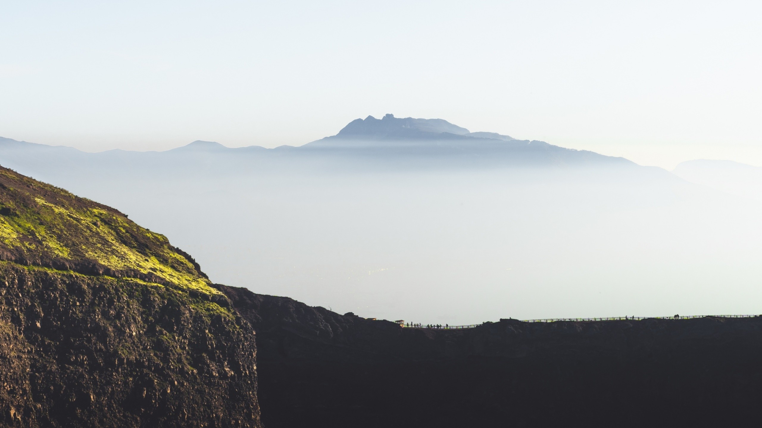 This hills and mountains wallpaper keeps things calm and spacious. Dark foreground cliffs anchor the view, while a soft band of morning haze floats over distant peaks. As a result, the scene feels airy without looking empty.