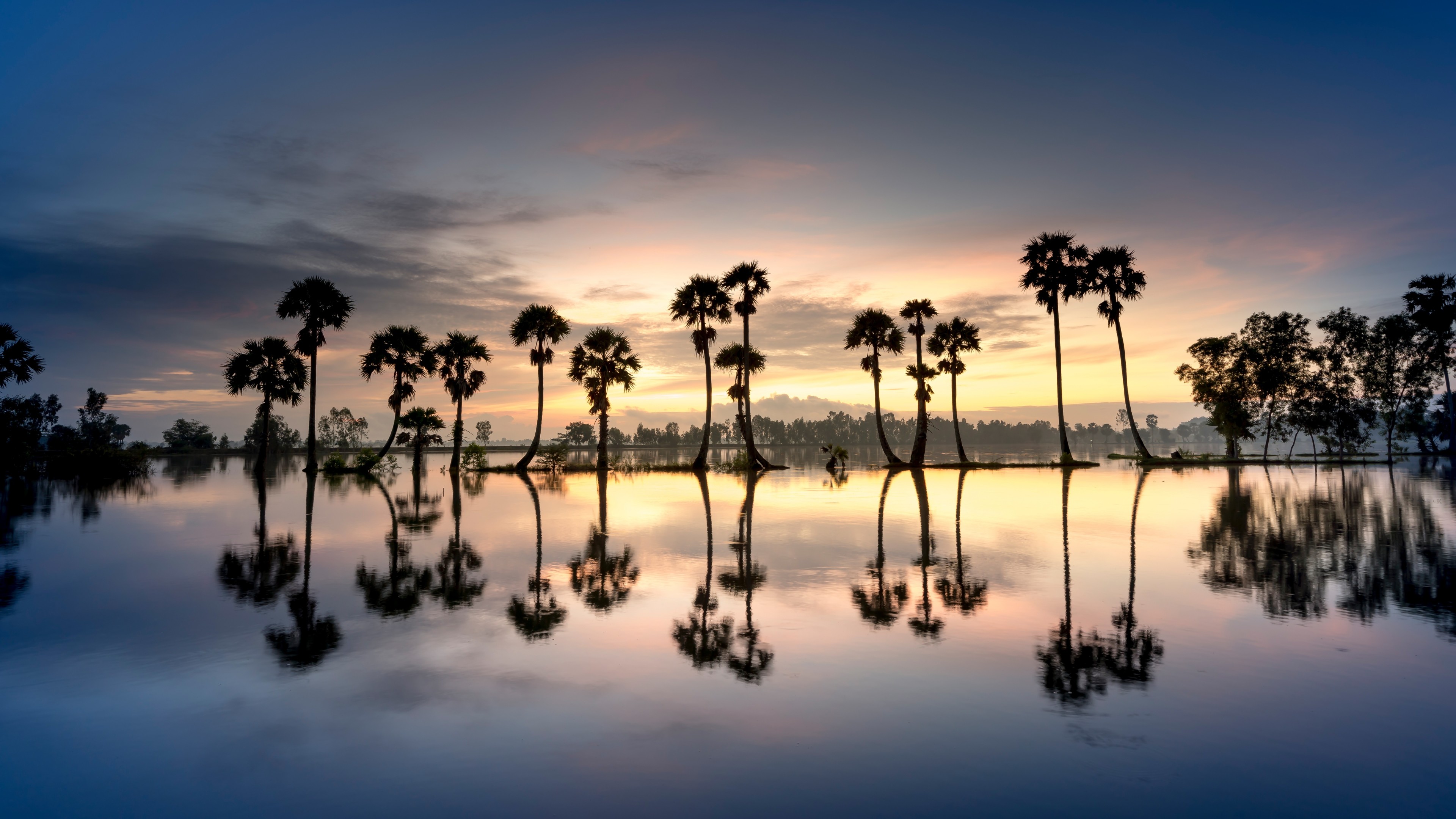 Quiet water, tall silhouettes, and a slow-changing sky—this palm trees wallpaper leans into calm rather than clutter. The reflection line keeps the scene balanced, with the palms spaced evenly across the horizon.